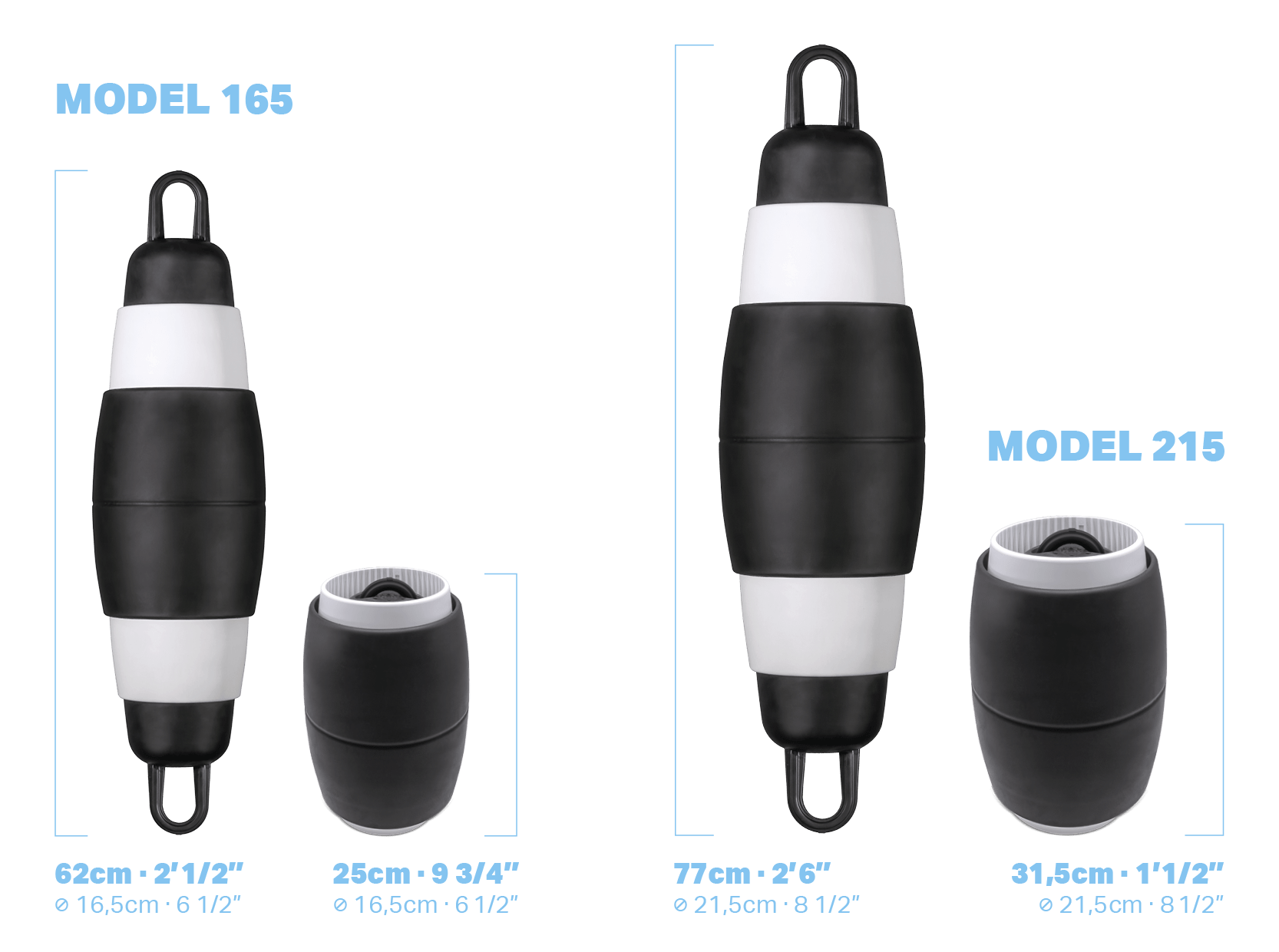Der POP Fender hat am Mittelteil den größten Durchmesser von 165mm bzw. 215mm und der teleskopierbare Bereich liegt bei einer Länge zwischen 250 bzw. 315 bis 620mm bzw. 770mm und einem Gewicht von 1,48 kg bzw. 2,5kg.